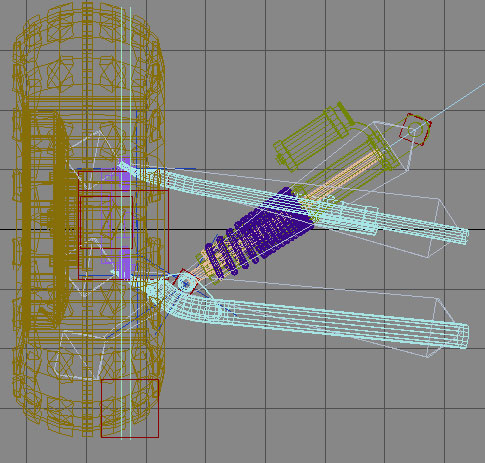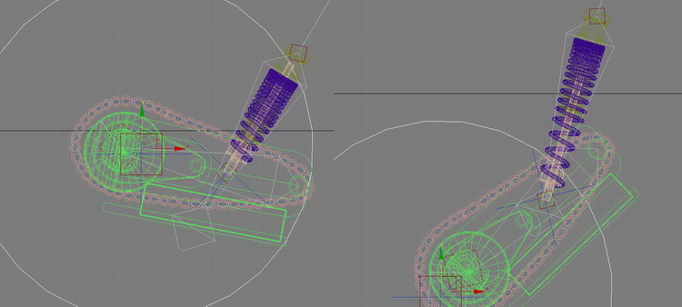 for the back spring same as front but instead I made a metal chain which actually loops correctly when the back wheel rotates.I made the chain using path deformation then controlled the percentage of path by the rotation of the wheel, simple but it works