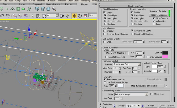 Simple brazil scene with Indirect illumination and an HDRI skylight and couple of fill light and some objects with brazil utility material