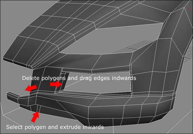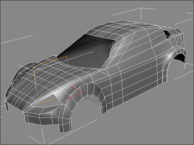 Go to the front of the car and shape the spoiler, the places where the air filters are you just delete the polygens and drag the edges inwards to get a hole like shape. This bit requires a lot of welding, be careful not to make to many segments because it may disturb your smooth.
