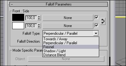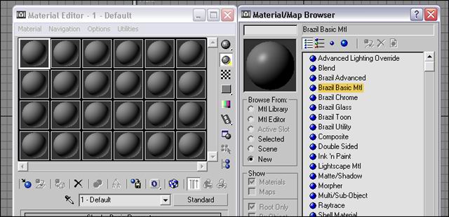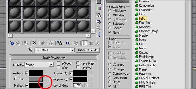 Now we are going to make the lacquer for our car. Choose the “Brazil Basic MTL” in the matrial map browser, you apply a falloff to the reflect slot. In the falloff menu you choose fresnel.