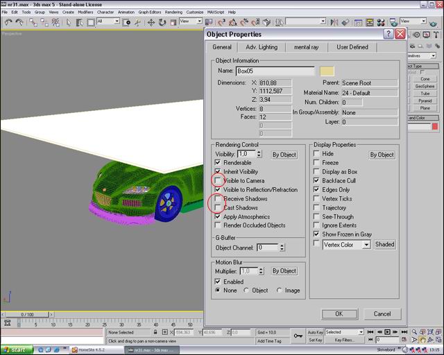 This material you put on your car, pick the color you like. Then you create a box that covers all the car and place it above it, this box is our reflection. Rightclick on the box and turn of “visible to camera”, “Recieve shadows” and “Cast shadows”. Go to your material editor and apply the brazil utility material to the box.