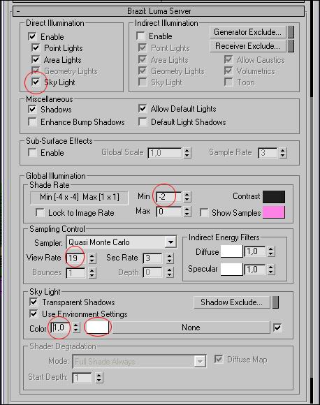 Go down to “Brazil Luma Server” and activate the sky light, set the shade rate to -2 and the view rate to 19. In the skylight color you set it to 1 and the color to white “ffffff”.
