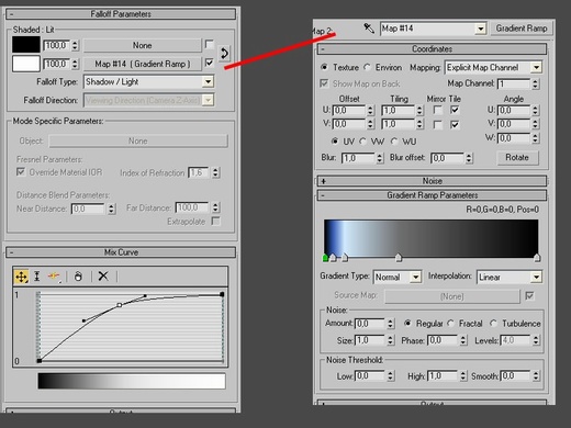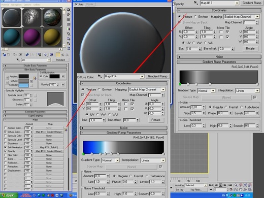 In Opacity bookmark also create Gradient Ramp material, here only monochrome shades of gray are used. It is desirable that the white color stripe coincides. Thiswill be the reflection in the atmosphere.