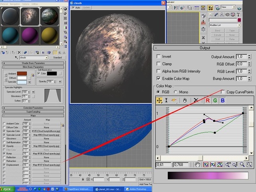 For inner Fallout material apply the same map as the previous bookmarks. But put Perpendicekfr/ Parallel into Fallout type, then the light on the planet surface where light and darkness are divided will not be so sharp in comparison with clouds.