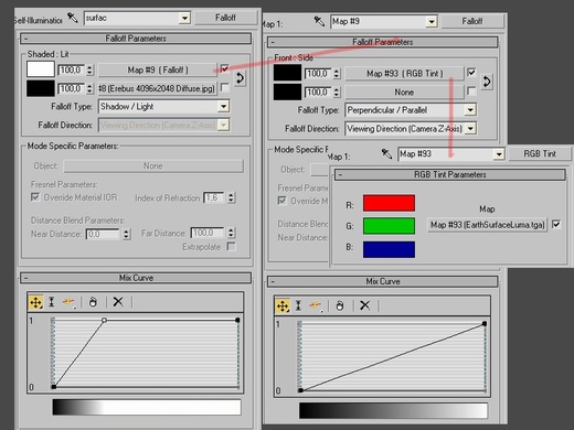 And the last but not the least Self-illumination bookmark. Create Fallout material which willconsist of Fallout map and that map which will illuminate your cities on the dark side of the planet. And Fallout type – Shadow/ light.