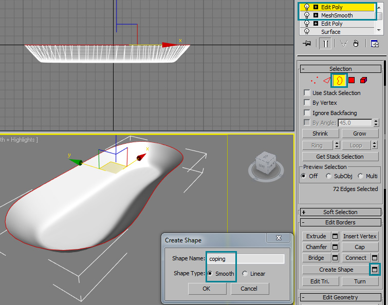 Now add a meshsmooth modifyer with a value of 2 iterations to give it a more natural and realistic look. Then add another edit poly modifyer and select the border at the top of the mesh. Create a shape from the selection and name it "coping." Use the "smooth" selection for the shape type: