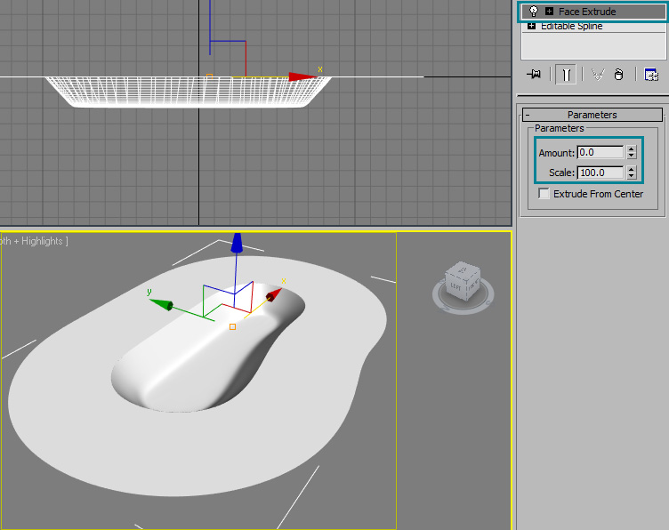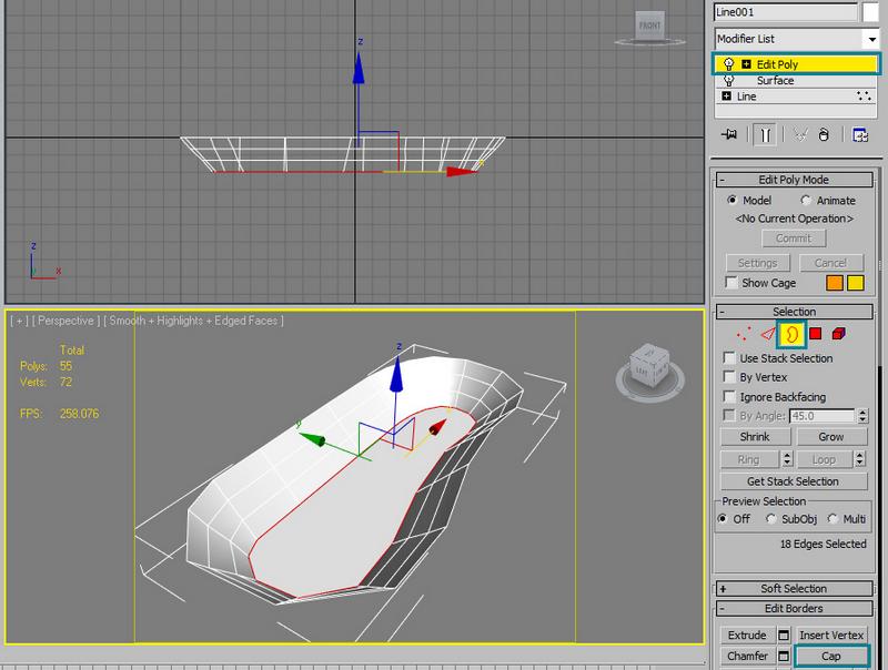 Now we need to add an edit poly modifyer to fix the surface. Select the border at the bottom of the shape and cap it: