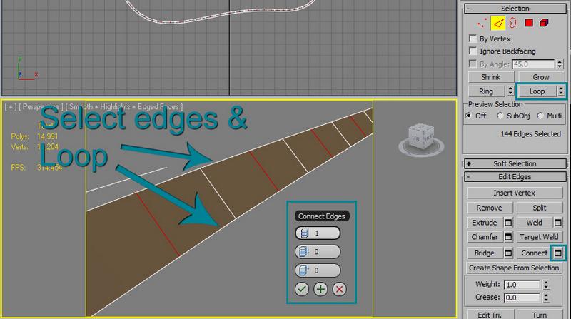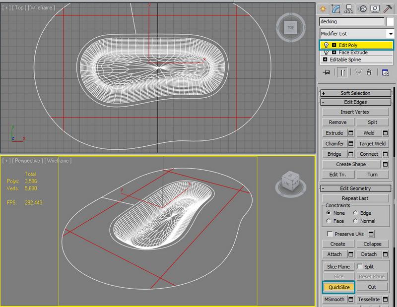 Now to make things easier, let’s turn the decking area into a rectangle instead of keeping it the same shape as the pool. Add an edit poly modifyer to decking, go to "edge" selection, and use the quick slice tool to cut some edges into a shape of a rectangle: