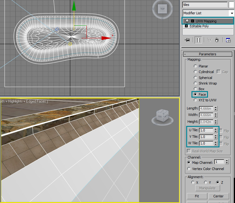 Now let’s take the top row of polygons of the pool interior and detach it from the mesh. We’ll use this set of polygons as our tiles: