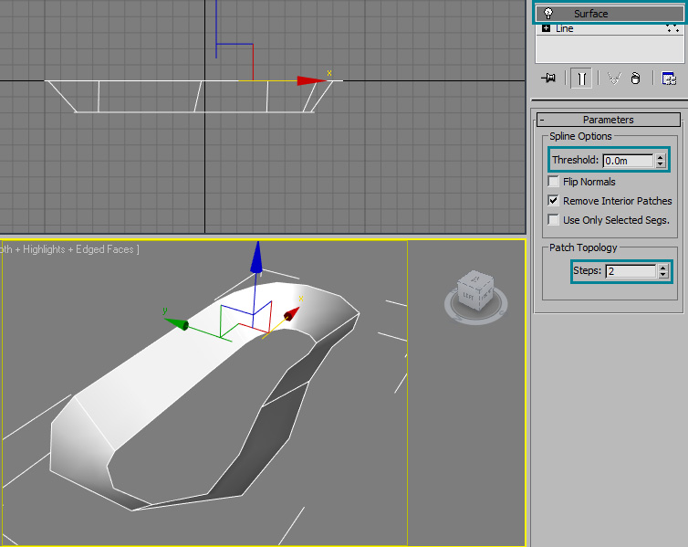 Add a surface modifyer to the spline with a threshold level of 0. I used 2 steps for my patch topology. Values may be changed depending on the individual shape, but in this case I kept the step rate low so modifying the geometry would be easier later on: