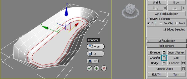 Now we have a surface for the plaster, but it needs some refining. Keep the border/edges selected and apply a chamfer effect to smooth out the bottom surface. I used a value of 0.1 with 2 segments: