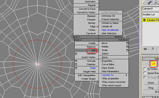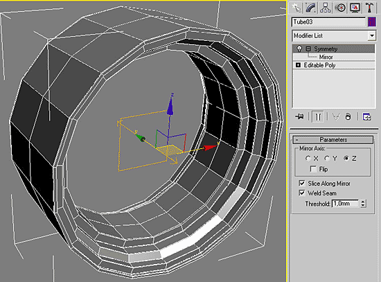 Click right mouse button on this cylinder and select convert to -> editable poly. Switch to polygon level and delete the odd polygons, we get this: