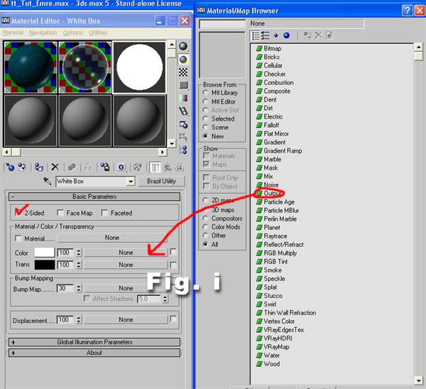 Get Brazil Utility material and select Output map in the white color slot, increase RGB level to 3.0 in the output map parameters.. Apply this material to the White Box that we have created..(Fig. i)