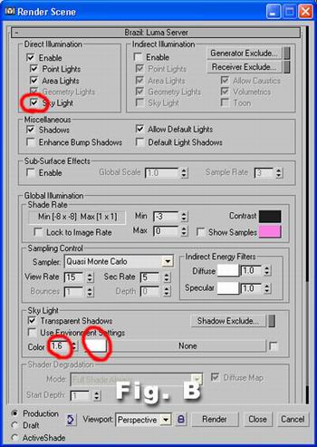 Go to Luma Server of Brazil settings, turn on Skylight, choose white color and 1.6 value (Fig. B)