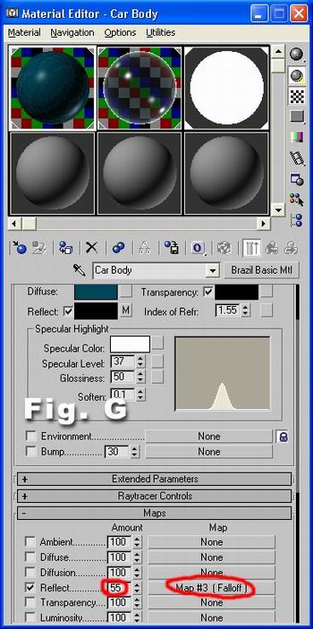 For the body of this car, get a Brazil Material, dark green for diffuse and Falloff map for the reflection. The diffuse color is upto your choice and you will see that it will need adjustment after the first test render (Fig. G and H)