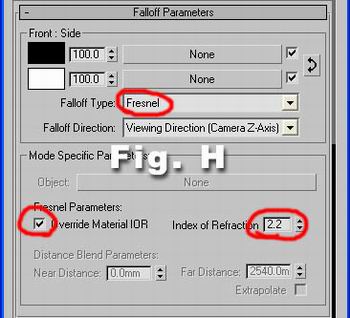In the maps section, select Falloff map for the reflection slot and choose Fresnel for the Falloff type leave it 1.6 in Index of refraction..