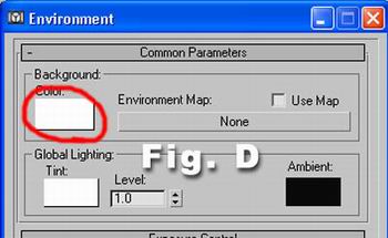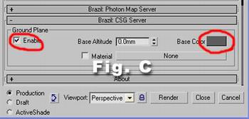Scroll down to Brazil CSG Server, enable Ground Plane and select a dark grey color (Fig. C), go to environment and select white for the background (Fig. D) These colors wont be the final ground and background colors, we will play around with them later..
