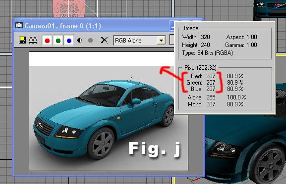 As you can see the dark grey ground plane (CSG Server Module), became brighter, thats the result of white skylight and its 1.6 value… but that plane ends at the edge of the horizon and our white environment background color makes this image nasty.. To fix this, right click on the rendering window, and get the RGB value of plane that meets with white color.. (Fig. j)