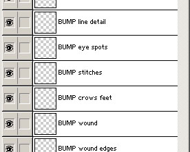 I also always do all the individual attributes maps in the same Photoshop file to ensure consistency from channel to channel, as I described above. Below is an image showing what my Layers palette for this head looks like. Click on the image to see the entire palette.