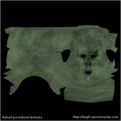 Once I had the procedural base looking somewhat along the lines of what I wanted, I baked them to an image using the UV map that I had set up earlier. In Lightwave, you do this by setting up the Surface Baker shader (found in the Shaders list in the Surface Editor) and setting the shader up to bake any particular surface to an image map using the UV map as a template. When you render the frame, Lightwave automatically begins the baking process. This one took a few hours to bake on my old PC (a PIII 500Mhz with 312Mb RAM).