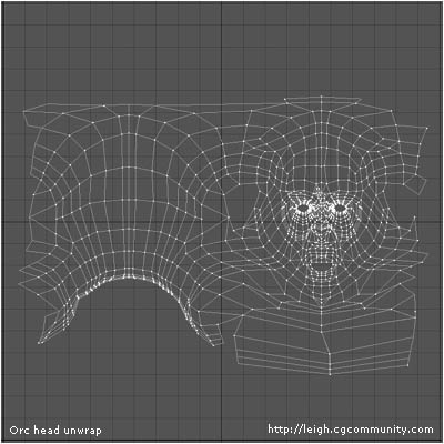 As with most heads, I decided to go with a cylindrical unwrap for the main head texture maps. After the initial unwrap, and some fairly extensive editing, I ended up with this UV map, shown below.