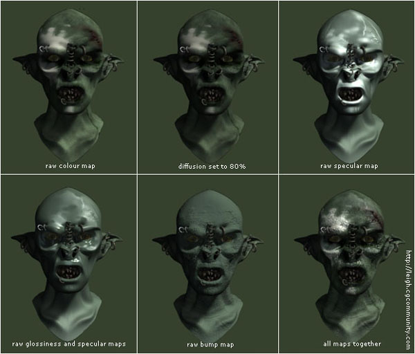 Below you can see the head model rendered with each of the individual maps applied. Click on each section to see the actual image map used.