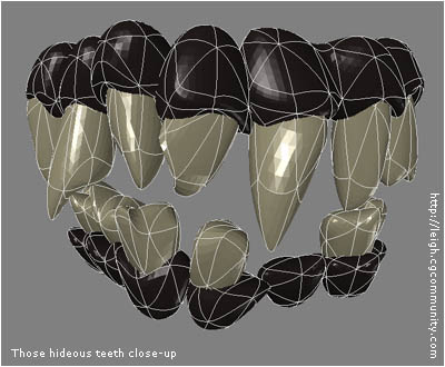 The teeth started out as normal teeth, which I then placed properly, and then just randomly pushed and pulled around to make them become jagged and viscious looking.