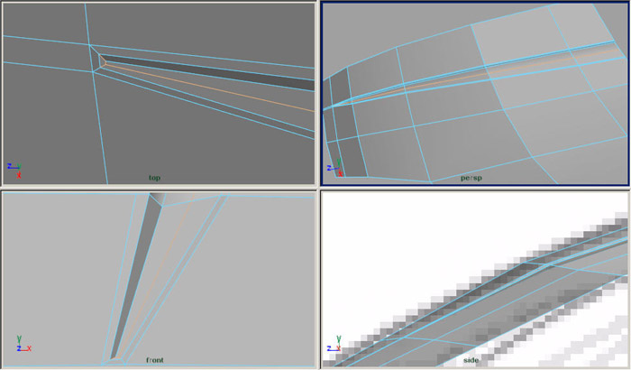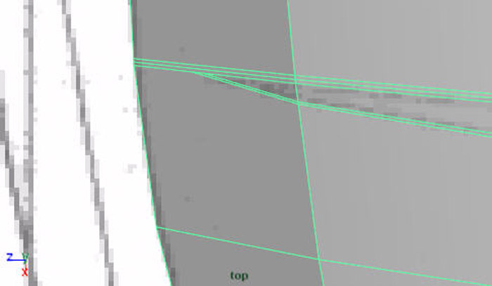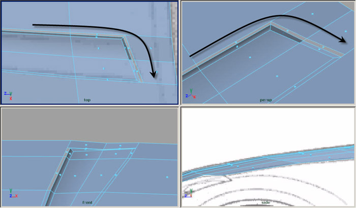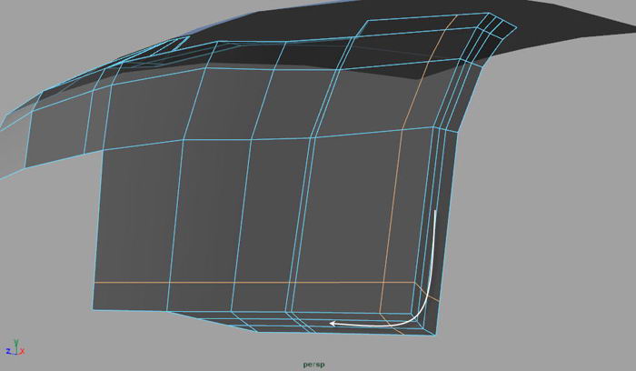 Now we pass to the other end of the cut that demands a similar procedure. A very important note: try to follow the direction of the surface that been modeling, otherwise the result will be worse. As an example, see the screen-shot next, with the arrow I have tried to evidence the direction of our cut. It is very important to be able to see the right direction of surface because is that that at the end determines the “professionality” of your job.