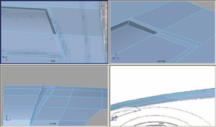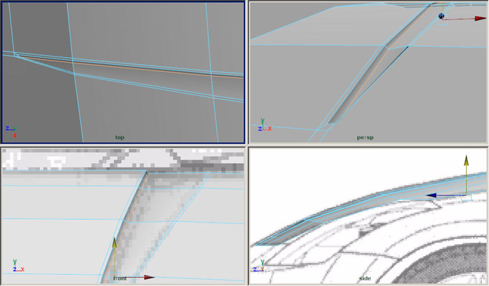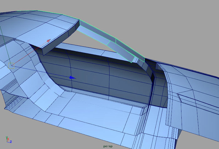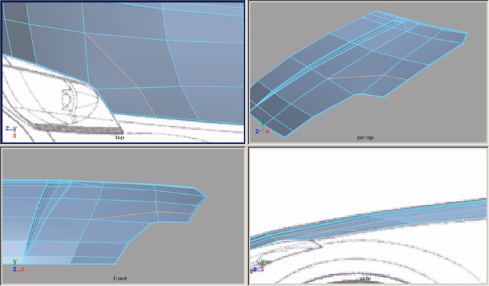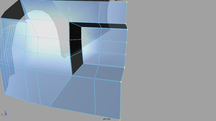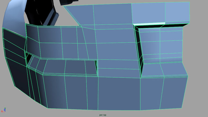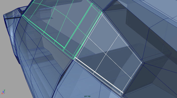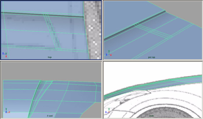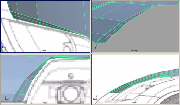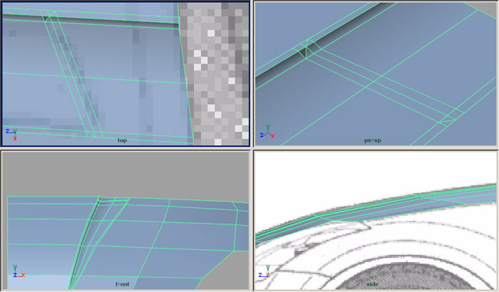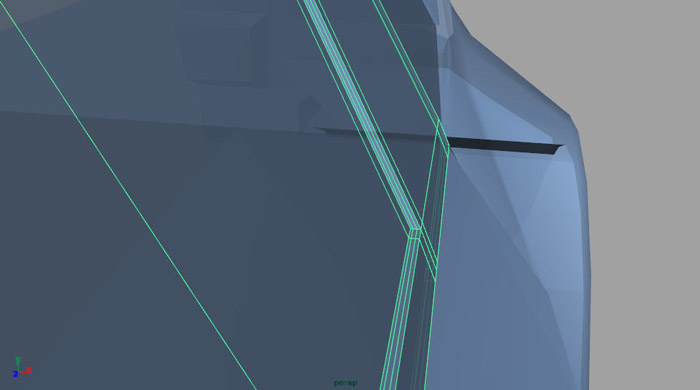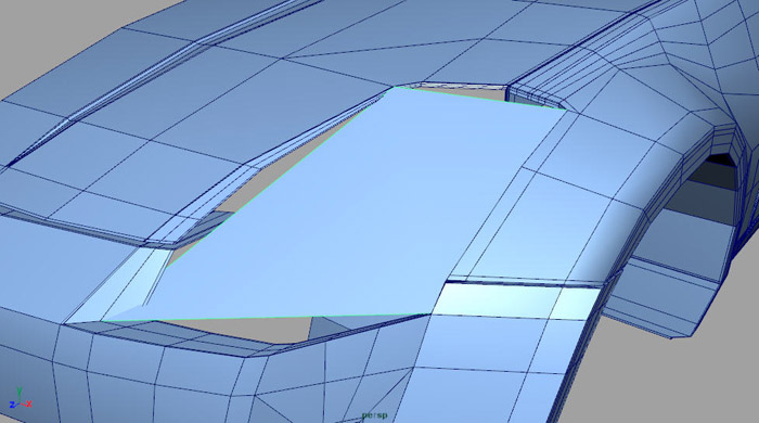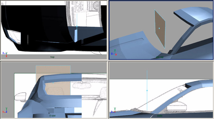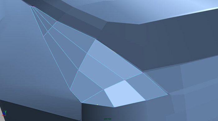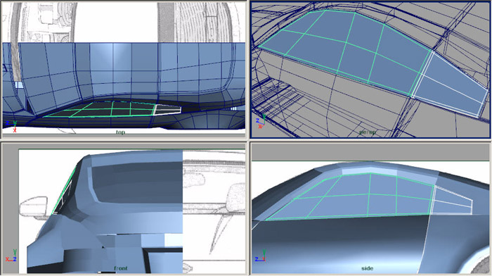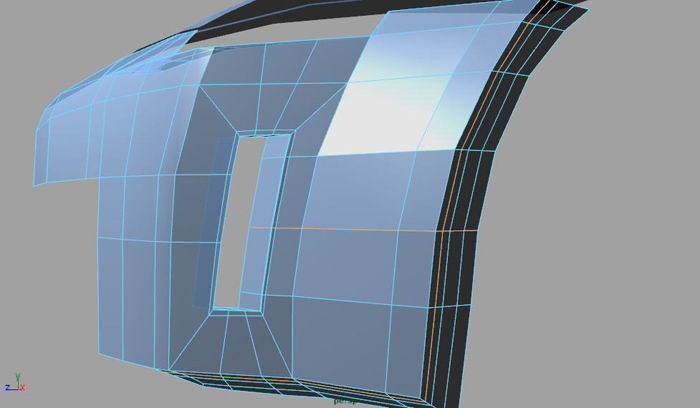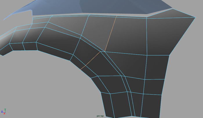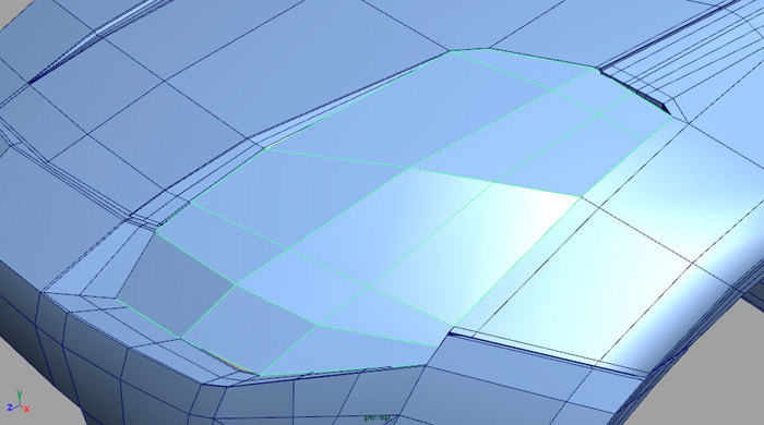 To make a cut on the hood begin to define the form using the Split Polygon Tool. Unfortunately the cut that we want to do, don’t coincide with the end of the piece that we modeling in none of the two extremities, that will tends to create some difficult and problems. Remember that the polygonal models in Maya must have 4 edge (namely 4 vertex), so try to avoid polygons that have 3, 5 or more edge because them tends to create problems with the smooth comand.