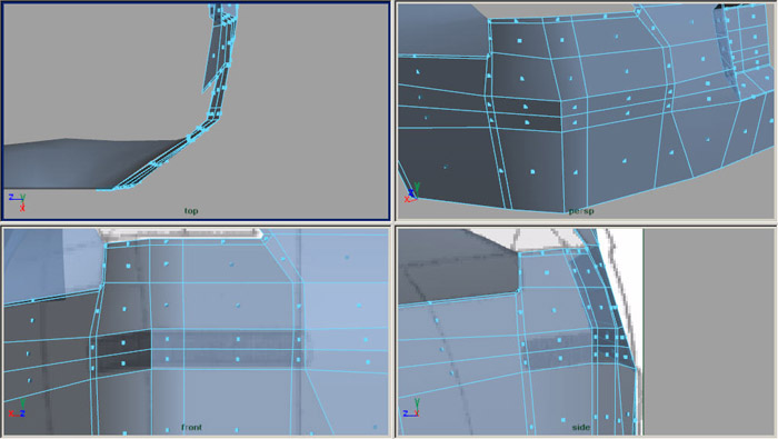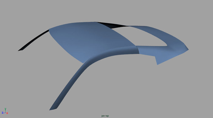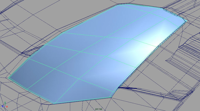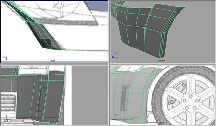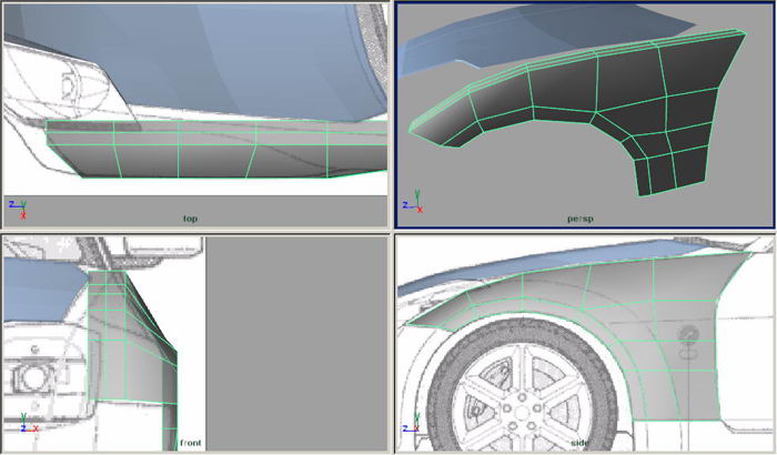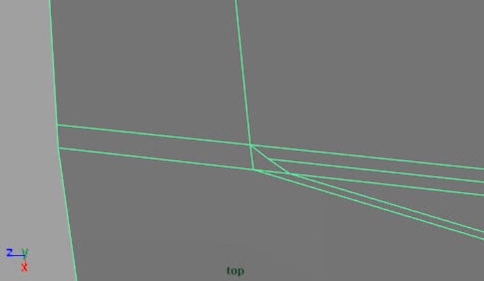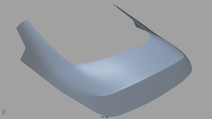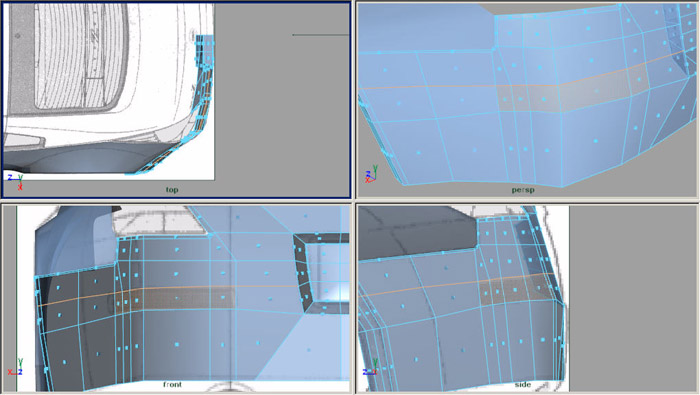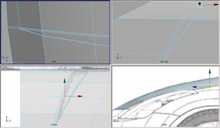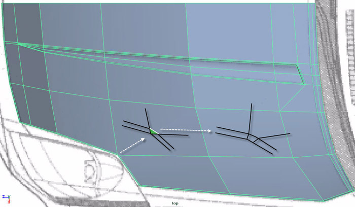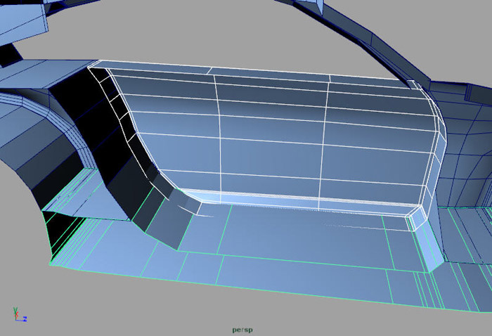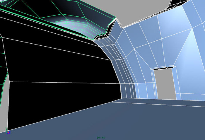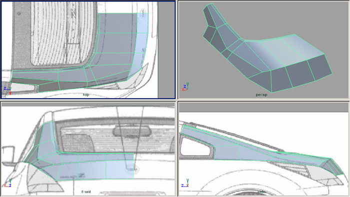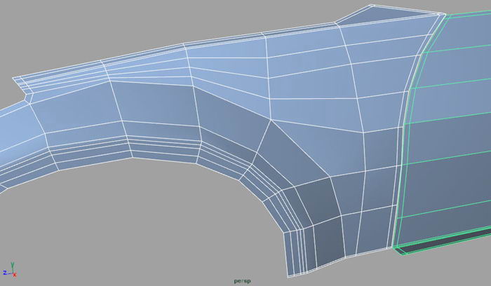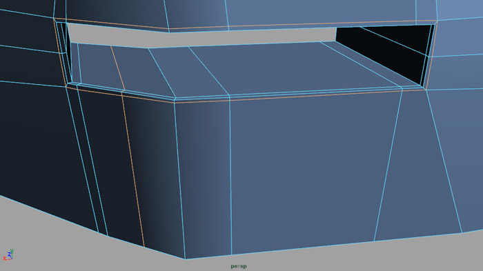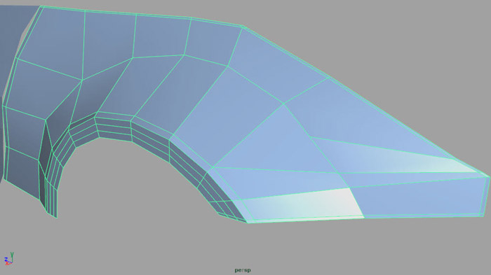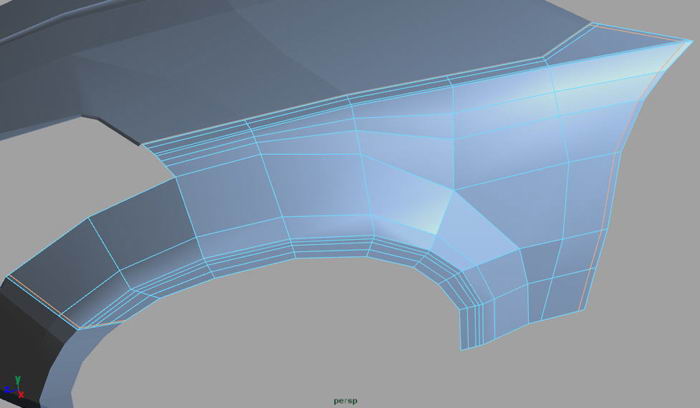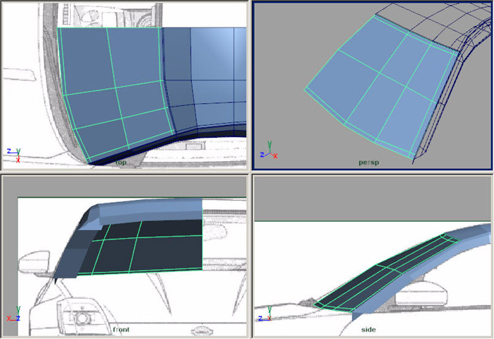 To make a cut on the hood begin to define the form using the Split Polygon Tool. Unfortunately the cut that we want to do, don’t coincide with the end of the piece that we modeling in none of the two extremities, that will tends to create some difficult and problems. Remember that the polygonal models in Maya must have 4 edge (namely 4 vertex), so try to avoid polygons that have 3, 5 or more edge because them tends to create problems with the smooth comand.