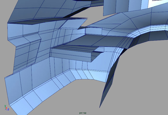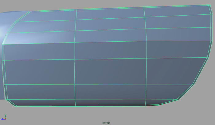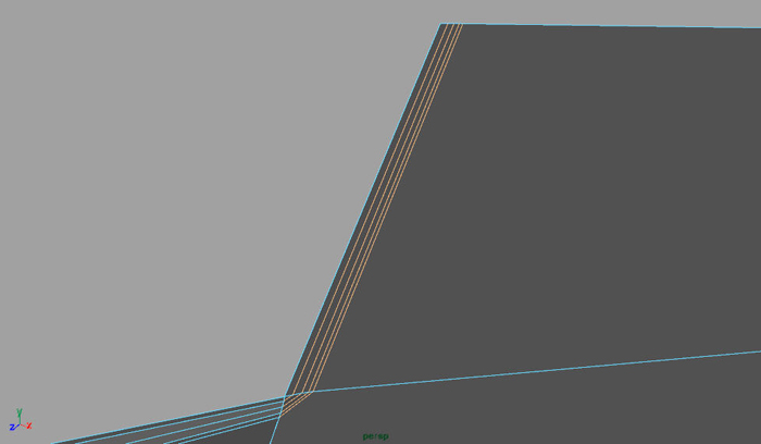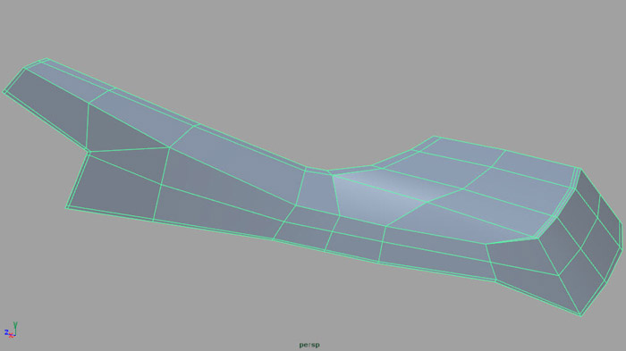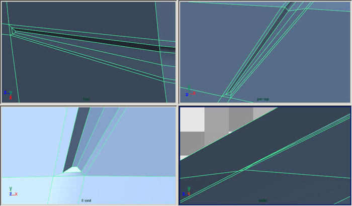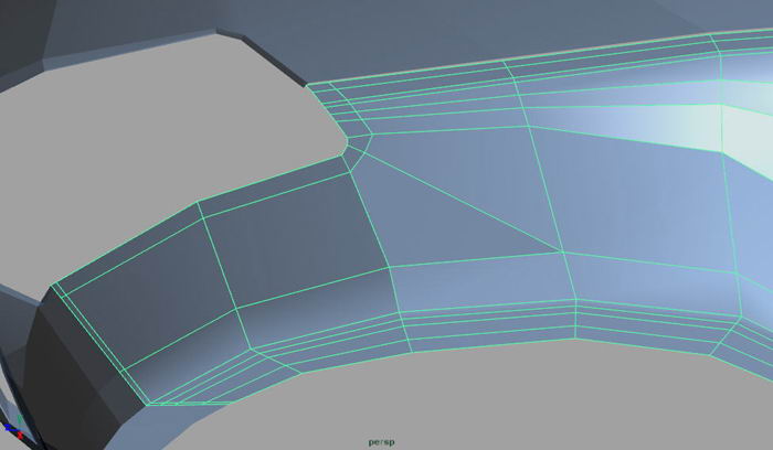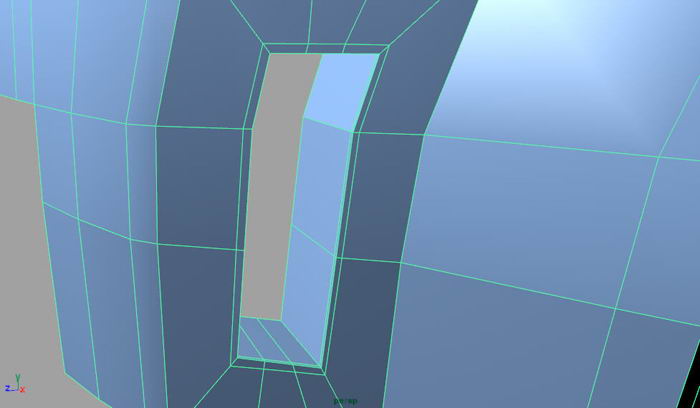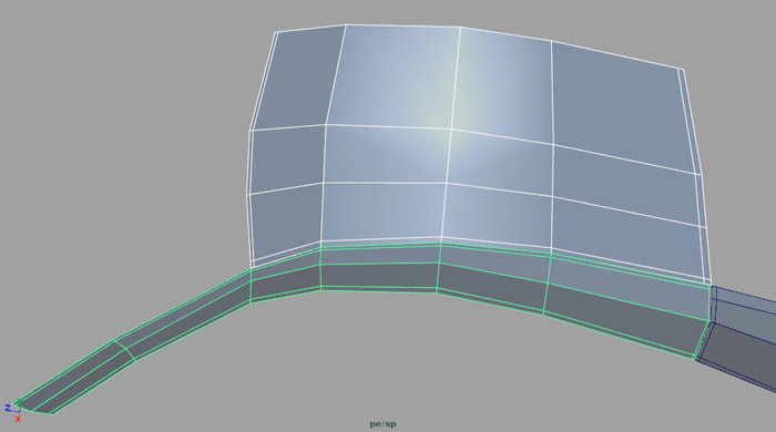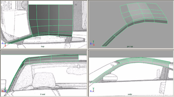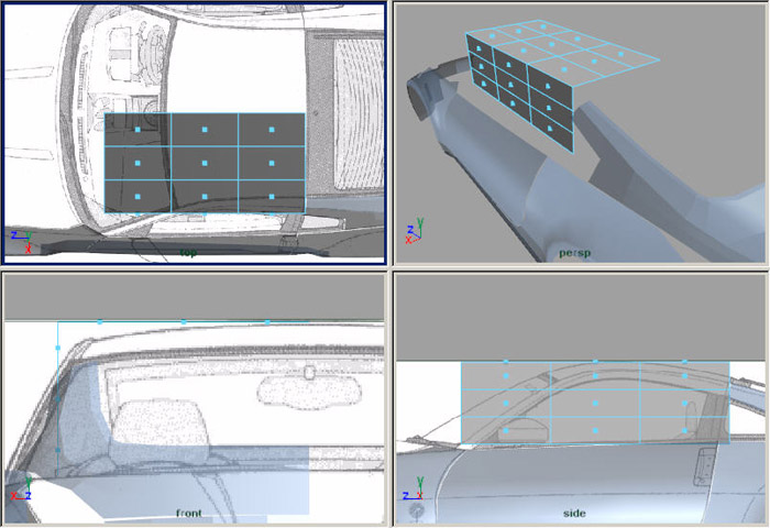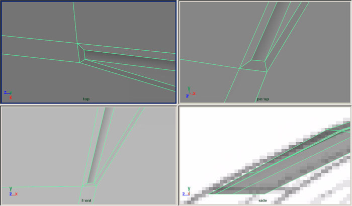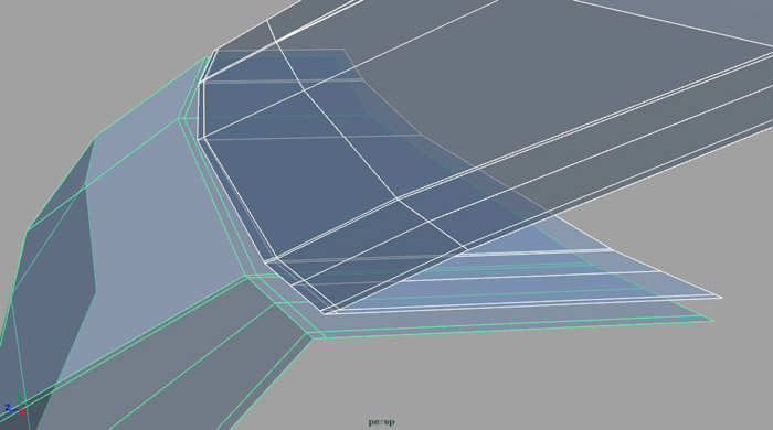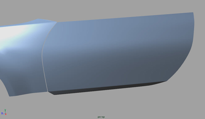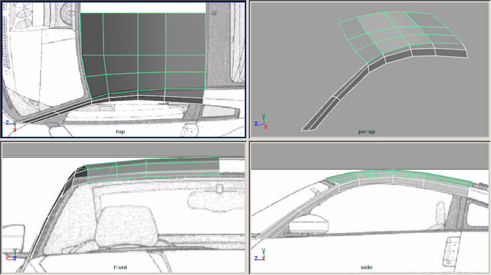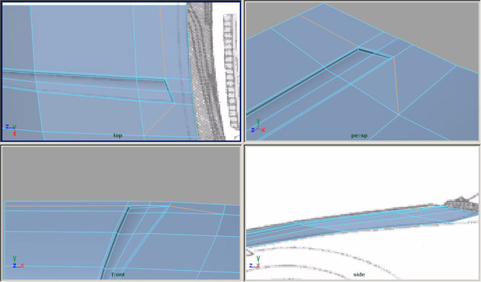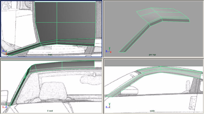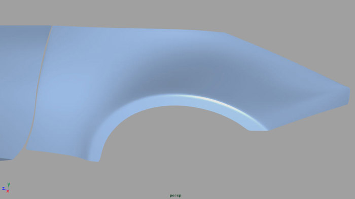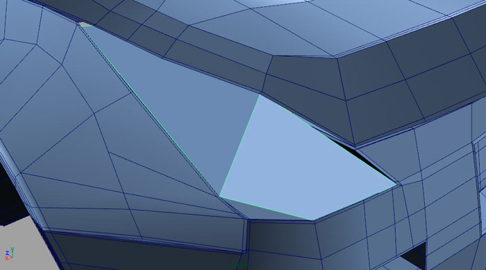 To make a cut on the hood begin to define the form using the Split Polygon Tool. Unfortunately the cut that we want to do, don’t coincide with the end of the piece that we modeling in none of the two extremities, that will tends to create some difficult and problems. Remember that the polygonal models in Maya must have 4 edge (namely 4 vertex), so try to avoid polygons that have 3, 5 or more edge because them tends to create problems with the smooth comand.