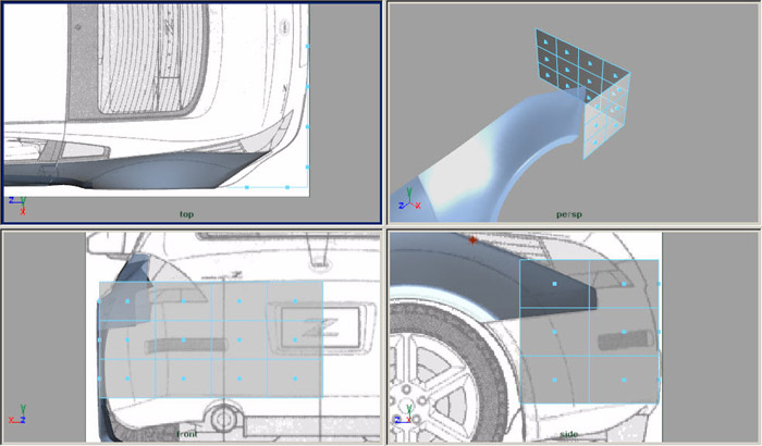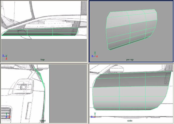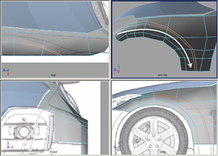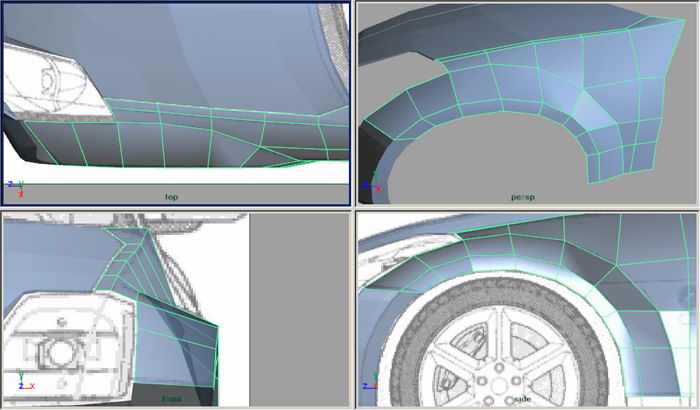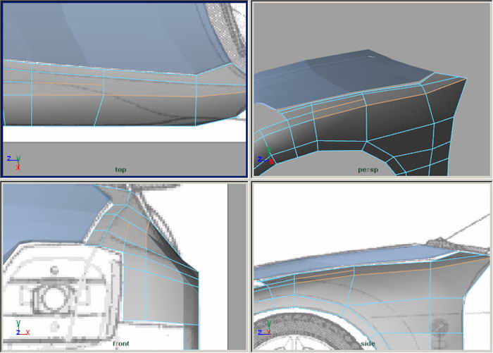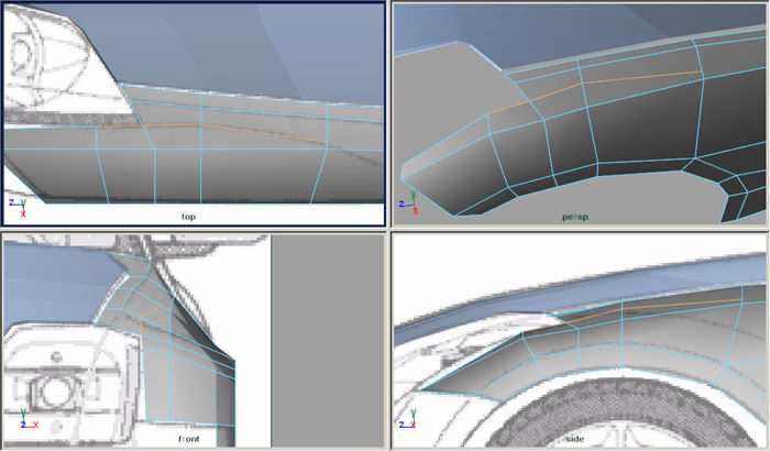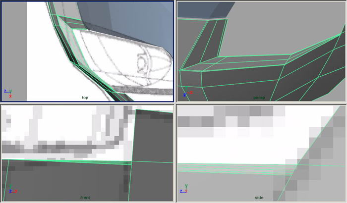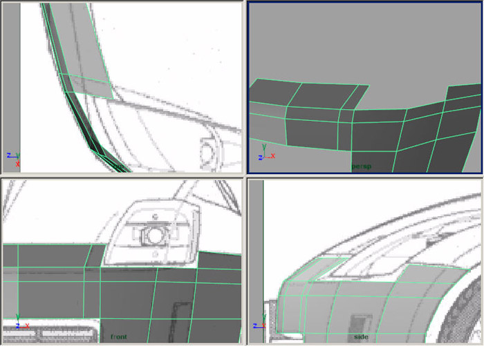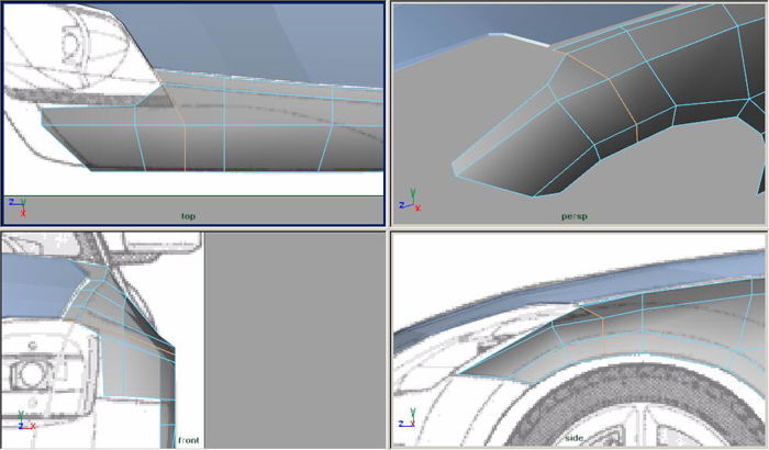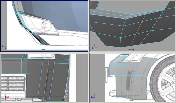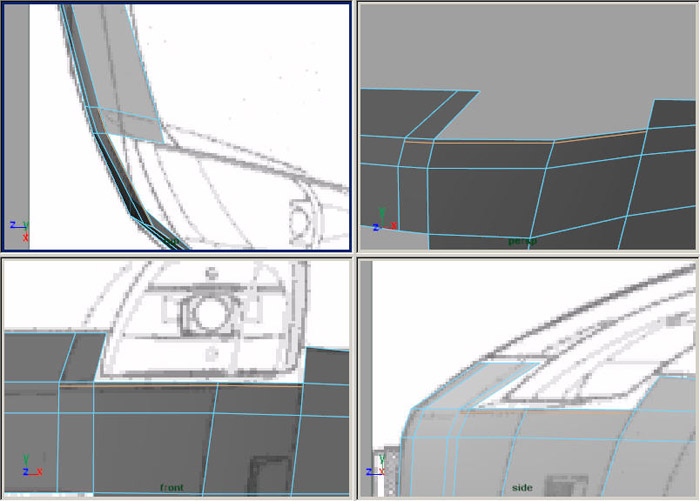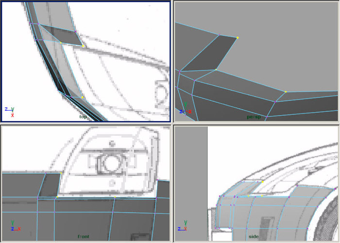 Moving some you vertices I have created the part of headlight. After with Split Polygon Tool I have added some line in order to better define the obtained result.