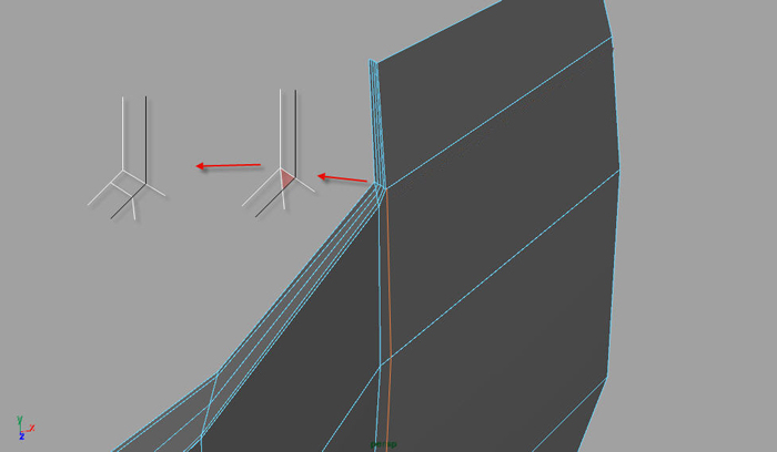 In this screen-shot I have evidenced the direction of the surface and therefore the direction that must assume the faces/edges in that zone.