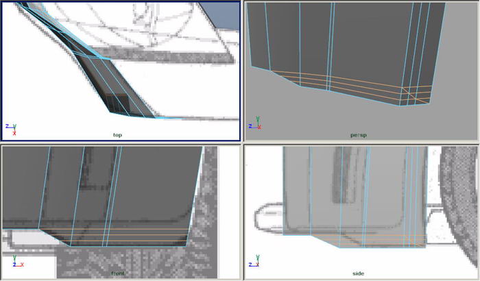 For define our model, we have need of other polygons (subdivisions). To do this activate the Split Polygon Tool command ( ) and in the Top View, traced some lines (the lines must start from one edge and finish on another one, and at the end you must confirm that with the Enter button on your keyboard) in the parts that request a major control, and adapt the new vertex to the blueprints. Try to not abuse of the Split Polygon Tool command, this is important, try to create only polygons that serve you. More useless faces, become only a problem because the surface become then uncontrolled.