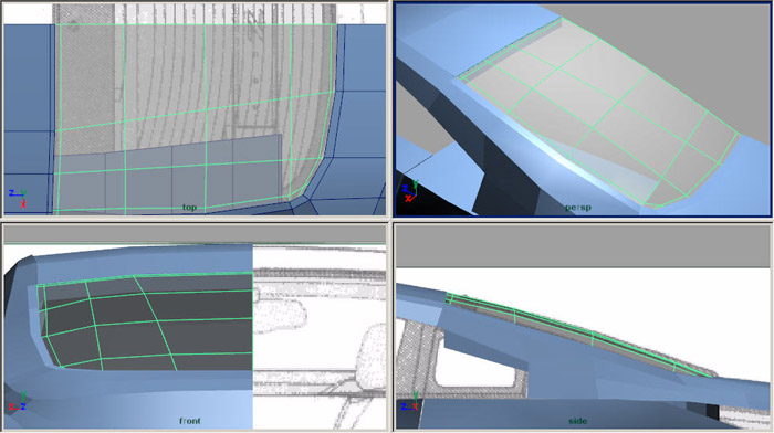 ) and in the Top View, traced some lines (the lines must start from one edge and finish on another one, and at the end you must confirm that with the Enter button on your keyboard) in the parts that request a major control, and adapt the new vertex to the blueprints. Try to not abuse of the Split Polygon Tool command, this is important, try to create only polygons that serve you. More useless faces, become only a problem because the surface become then uncontrolled.