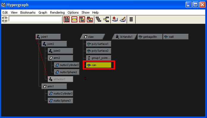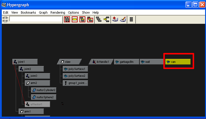 3-When you select the (CAN) drag it with middle mouse button and put on the claw it will automatically create child node under claw, as in the picture illustrating below.