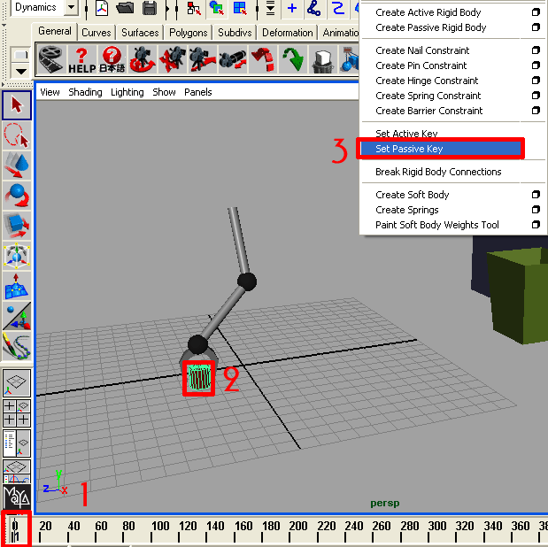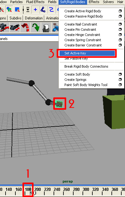 7-If you play still nothing happens still don’t worry, ok now scrub your time slider to frame 180 or above and then stop there now go to (Soft/Rigid Bodies>>Set Active Key) as in the picture illustrating down.