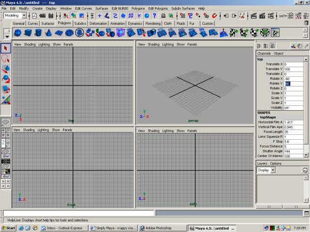 Now to bring them into Maya. Open Maya and go to four camera view. Now select the top view camera and rotate it 90 in Y. This will keep the images aligned.