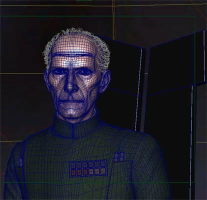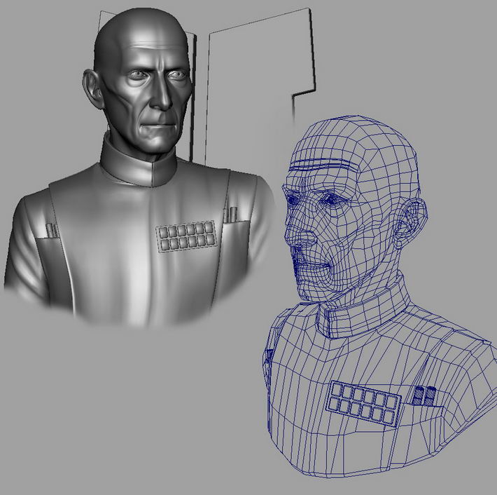 Moff Tarkin’s edge loops. Mouse over the image to see before and after the smooth algorithm is applied. Note how the resultant geometry is 100% quads even though some of the initial geometry is not :