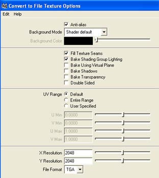 I’d then use the UV snapshot function to export this image as a targa and bring into Photoshop. A wireframe such as above however, can be a pretty daunting place to start for creating a texture map. Most CG packages allow for baking out a lit and shadowed map. In Maya, its called ( from the Hypershade ) the ‘Convert to file texture’ option: