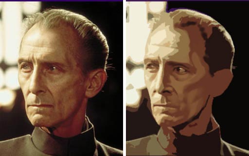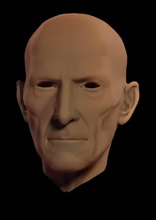 The ears disappear at one point, because I bolted on new ones from an existing model of mine. And why the hell not?! Ears are a bitch! Once the model reaches a certain point, it’s really just a case of implicit observation of the subject to get it to where you need it to be. Try and break up the face structure as you look at it into simpler planes. Here, I’ve applied a cutout filter in photoshop, and painted into it a little, to try and figure out the most basic facial planes:
