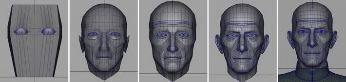 How you actually go about physically modeling is entirely up to you, and everybody I know seems to have a different way. Very generally though, whether you’re using Maya, XSI, Silo, Wings or whatever, the techniques and tools are the same. I tend to start with a cube. I then delete one side of the faces and instance mirror the geometry. That way Im working on one side and the other is being updated instantaneously. I tend to model ‘around the eye’ since the eye is just the most obvious place to start to me. I then simply draw topology onto the cube, tweak, and repeat. There are really very few tools that I use for actual mesh editing. Some kind of tool that enables drawing on the mesh ( in Maya it’s the split poly tool ) , extrude, bevel is really about all you need at the most basic level.