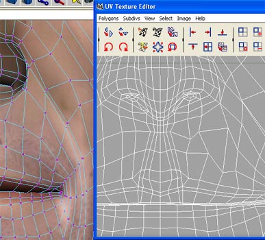Mouse over the image below. Note the texture swimming on the upper lip is due to the lack of resemblance between polygonal and UV layout. Note how once the UV co-ordinates more closely resemble the polygon layout the texture warping dissapears: