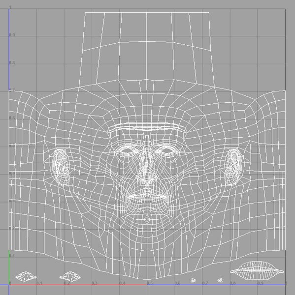 However, If you look at the flattened out UV’s top right, the basic feature layout of the wireframe, doesn’t really resemble the models face proportionally, and that will lead to UV stretching. Roughly speaking, the closer your UV layout resembles your polygonal mesh layout, the less UV stretching you will have. I’ve seen a failing to grasp this principle so often, that I feel compelled to spell it out rather obviously! :