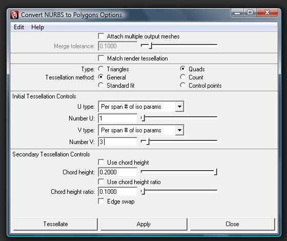 The reason we want the U, V to be set (1, 3) is because we don’t want our poly shape loses much of its details while still is a Low Poly. If you compare the poly version to the original NURBS surface, you can clearly notice that we have lost some of the curvature but don’t worry since we later apply a mesh smooth on it.