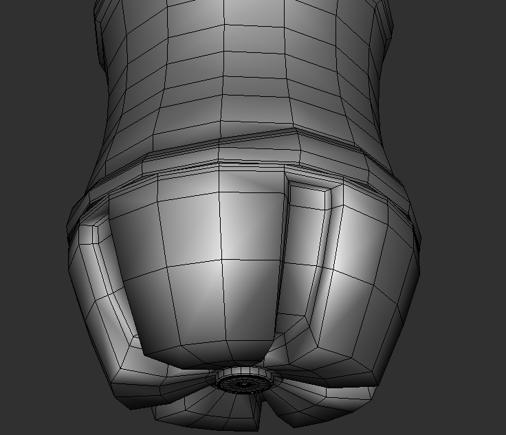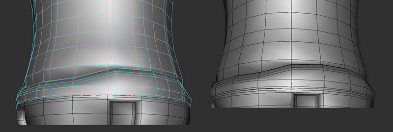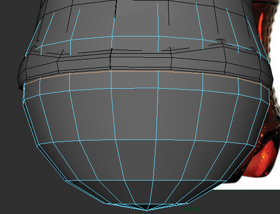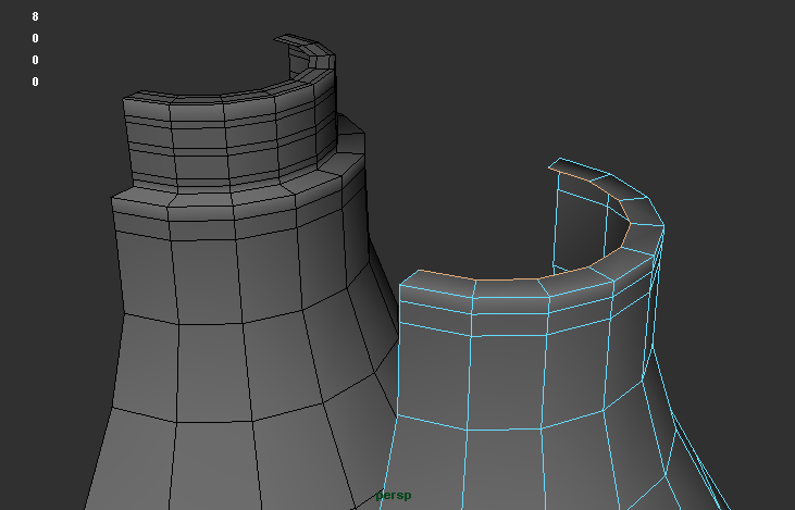 Now it is time to connect the middle part to the bottom and merge them together. As we saw earlier in this tutorial, number of subdivisions differed for both middle and bottom part. To fix this problem, we add some new edge loops to the middle part to match the edges of bottom and then we simply delete all the old edges that don’t match .