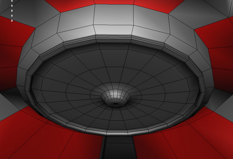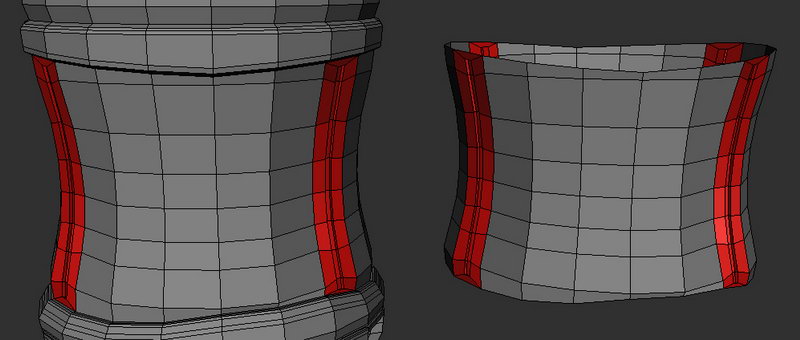 Next, add new edge loops at the end of bottom part. Assign a red color material to those polys that we don’t need to work with. This way, you can focus on other parts and won’t get confused later when we extrude the polys between them.