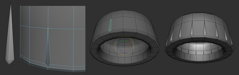 Next, we extrude the polys between those polys we already colored and extrude them two times towards inside. I have selected the edges where the second extrude should occur for your guide.