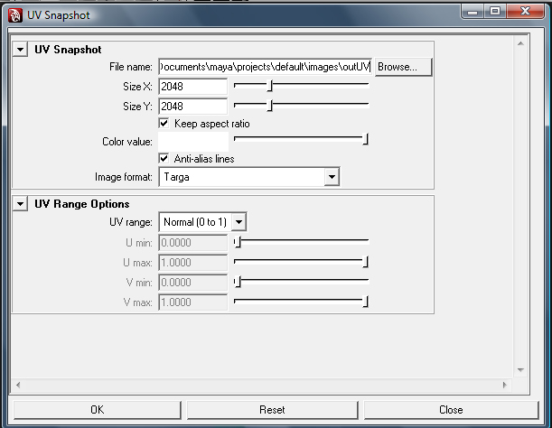 Select “Coca_Bottle”, and then go to “UV Texture Editor”. Once UTE pops up, go to “Polygonsà UV snapshots… set its options as following: