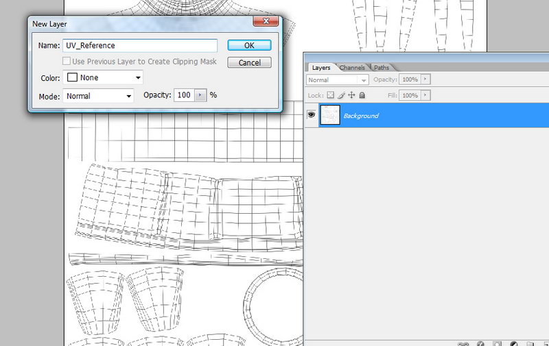 Once UV image is loaded in Photoshop, press “Ctrl+I” to invert the colors. Double click on the lock icon to pop up the new layer window. Call the new layer “UV_reference” and hit ok.
